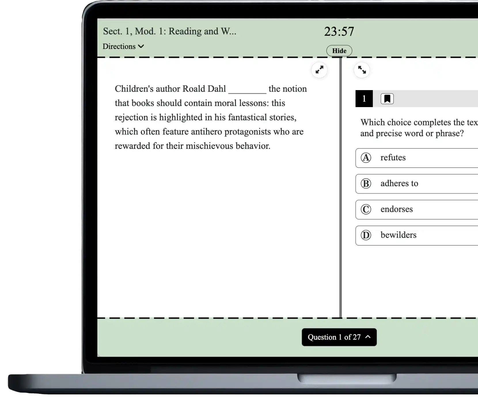 Resolve Prep offers the eight highest quality digital SAT tests on the market. Each test is meticulously designed to mirror the official SAT in both format and difficulty. Our tests are the perfect way to simulate the real test experience.